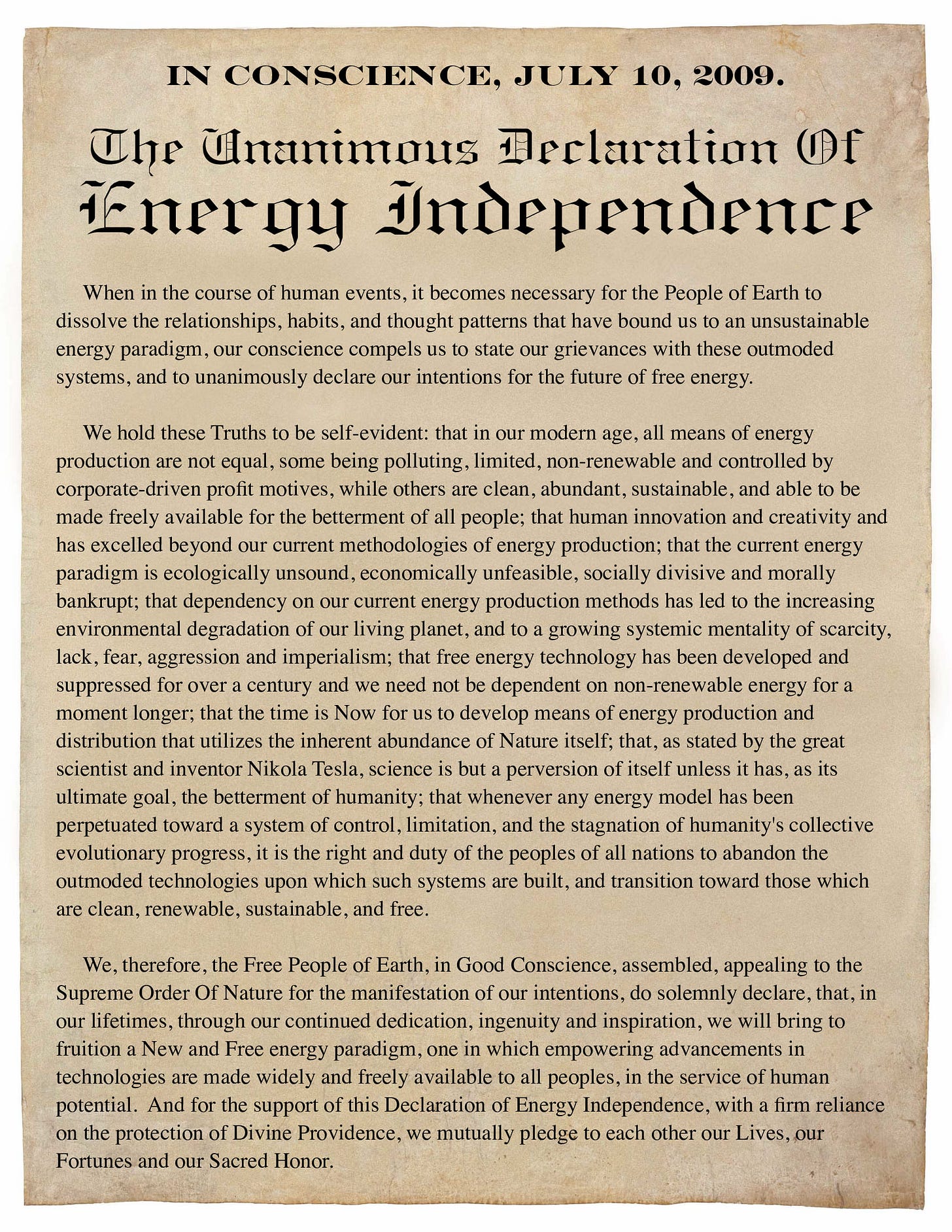We therefore, the free people of earth, in good conscience, assembled, appealing to the supreme order of nature for the manifestation of our intentions, do solemnly declare that in our lifetimes, Through our continued dedication, ingenuity, and inspiration, we will bring to fruition a new and free energy paradigm, one in which empowering advancements in technologies are made widely and freely available to all peoples in the service of human potential. And for the support of this Declaration of Energy Independence, with a firm reliance on the protection of divine providence, we mutually pledge to each other our lives, our fortunes, and our sacred honor.